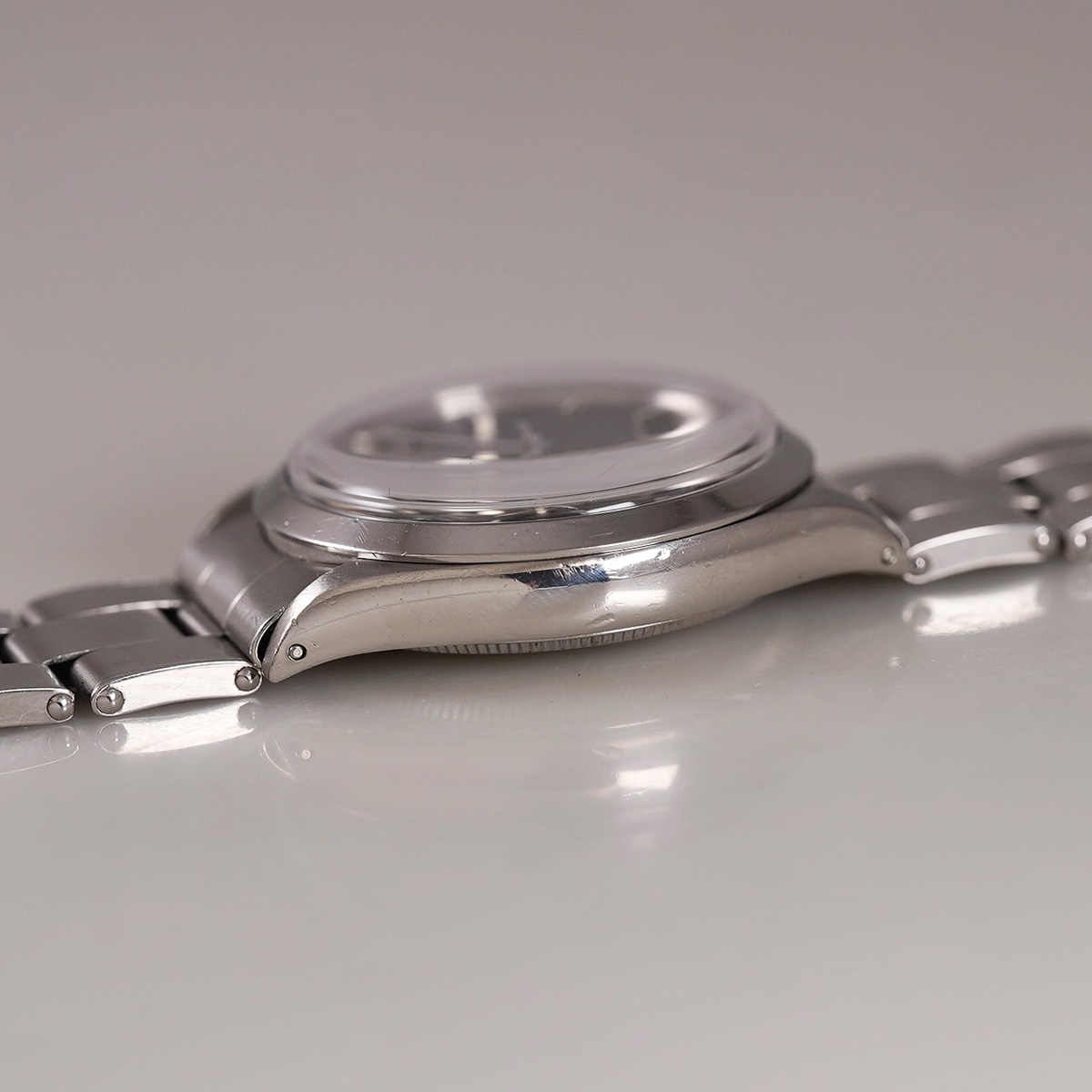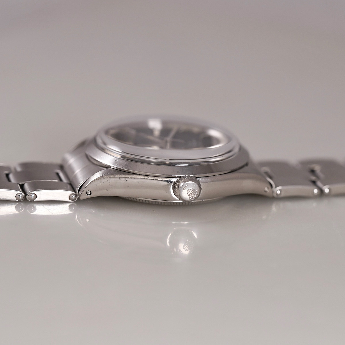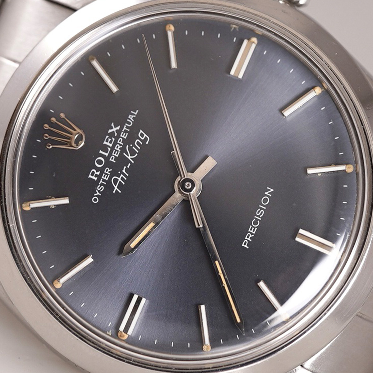 ヴィンテージ.ロレックスの自動巻モデルの中でも人気の高いRef.5500のエアキング。その中でも限られた期間にのみ生産されていた希少なオリジナルの.ブルーグレーダイヤルの1971年製になります。 ヴィンテージ.ウォッチでは、当時からのオリジナルカラー文字盤の現存数が少なくなってきており、人気とともに高騰しているのが現状です。この文字盤のブルーとも、グレーとも呼べない中間色になり、他では味わえないカッコ良さ!こちらの個体は、目立つような痛みも無く、不自然なリペア箇所も見られず、オリジナリティーが高く、コンディション良好。 光の当たり方によって様々な表情を楽しめる一本。 シンプルな定番モデルならではの使いやすさは、老若男女問わず、オンオフ問わず全てのスタイルにマッチする優れもの。 小傷はありますが、伸びの少ない FF357-7835.19 ロレックス純正.リベットタイプ+ステップバックル(こちらも限られた期間のみの知る人ぞ知るディテール!?)の3連ブレスを装着(12コマ:腕周り〜19.5cm程まで装着可能)。時計本体(裏蓋III .71年)と72年2期製のブレスと年式の整合性がとれています。分解掃除を済ませ日差15秒程で稼働しております。 | |