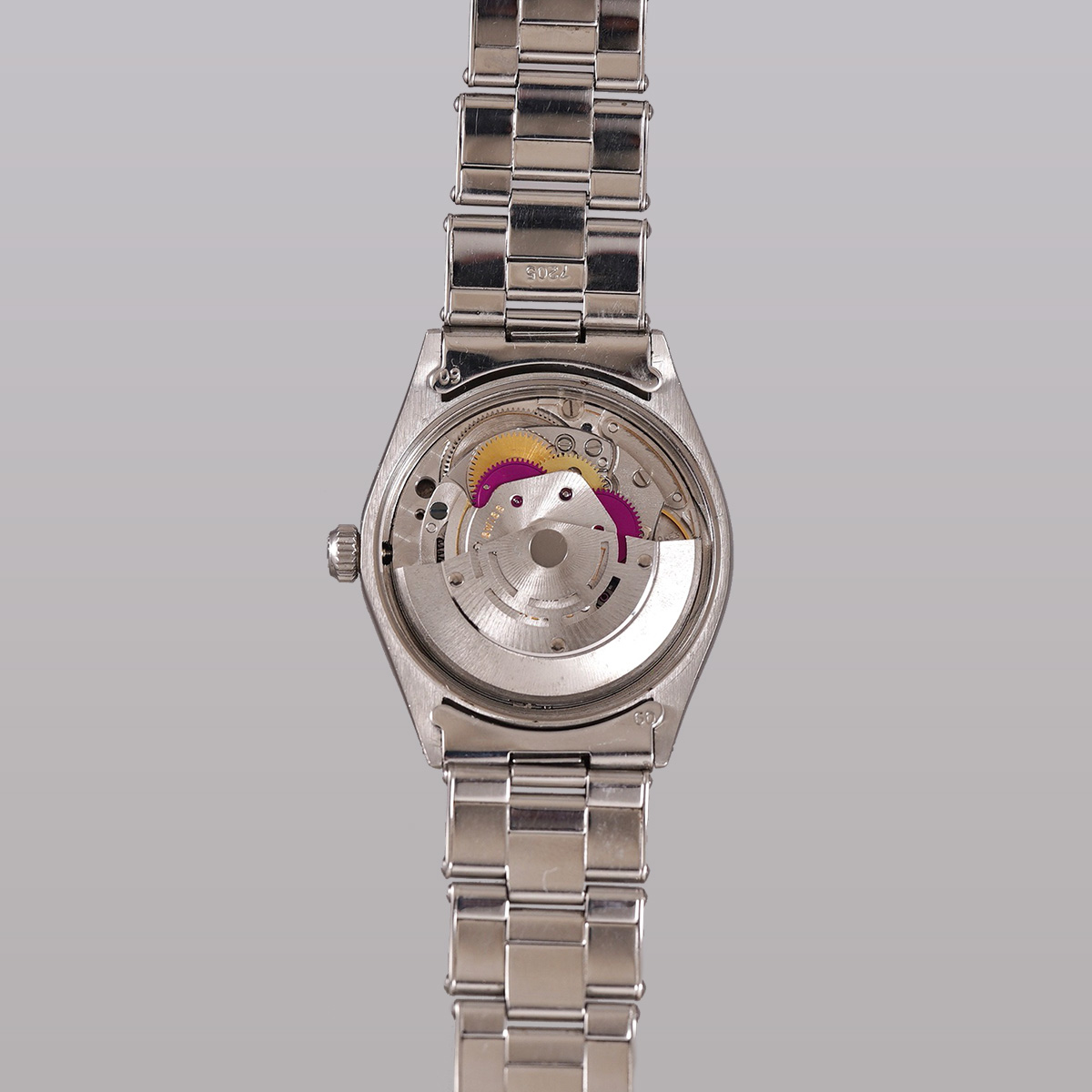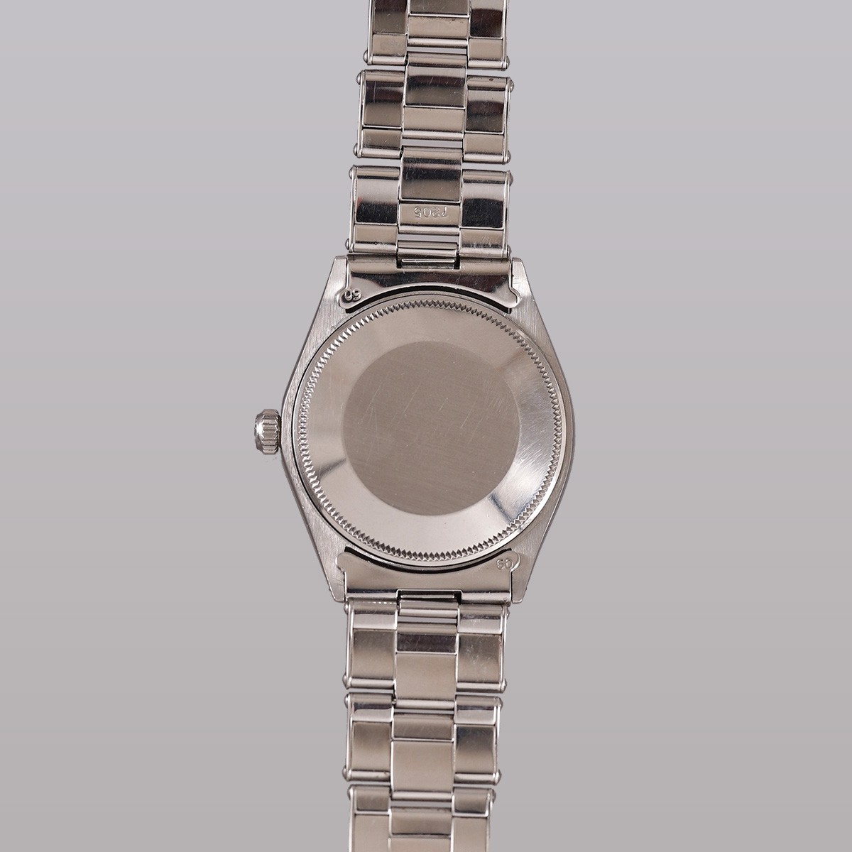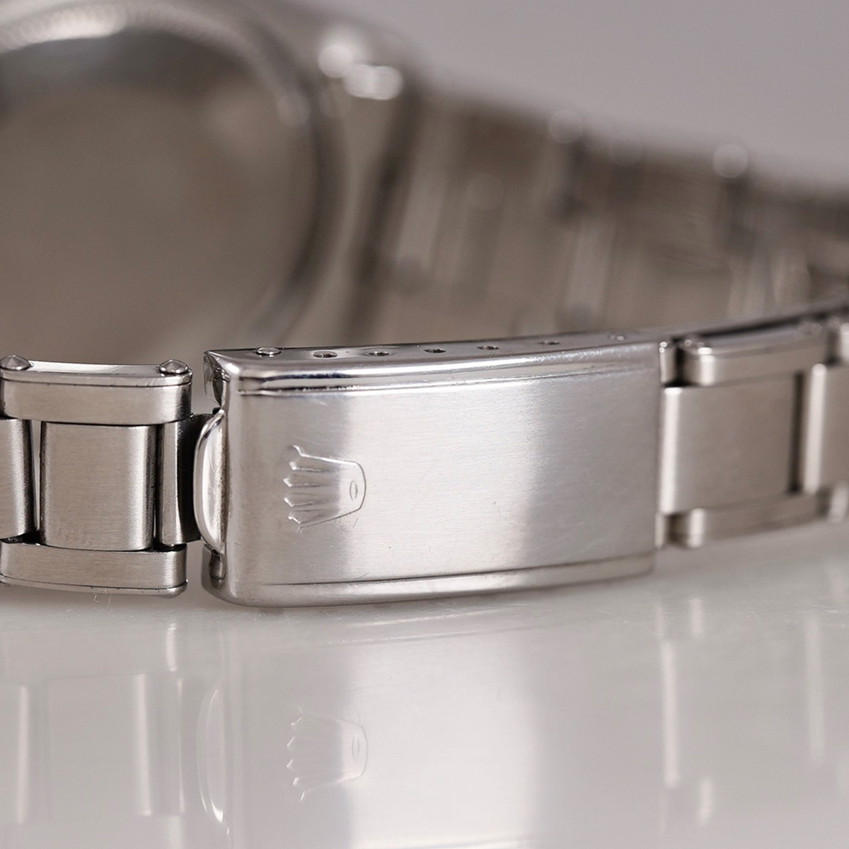 ヴィンテージ.ロレックスの自動巻モデルの中でも人気の高いRef.5500のエアキング。その中でも限られた期間にのみ生産されていた希少なオリジナルの.ブルーグレーダイヤルの1971年製になります。 ヴィンテージ.ウォッチでは、当時からのオリジナルカラー文字盤の現存数が少なくなってきており、人気とともに高騰しているのが現状です。この文字盤のブルーとも、グレーとも呼べない中間色になり、他では味わえないカッコ良さ!こちらの個体は、目立つような痛みも無く、不自然なリペア箇所も見られず、オリジナリティーが高く、コンディション良好。 光の当たり方によって様々な表情を楽しめる一本。 シンプルな定番モデルならではの使いやすさは、老若男女問わず、オンオフ問わず全てのスタイルにマッチする優れもの。 小傷はありますが、伸びの少ない FF357-7835.19 ロレックス純正.リベットタイプ+ステップバックル(こちらも限られた期間のみの知る人ぞ知るディテール!?)の3連ブレスを装着(12コマ:腕周り〜19.5cm程まで装着可能)。時計本体(裏蓋III .71年)と72年2期製のブレスと年式の整合性がとれています。分解掃除を済ませ日差15秒程で稼働しております。 | |