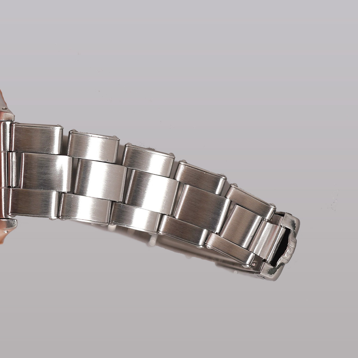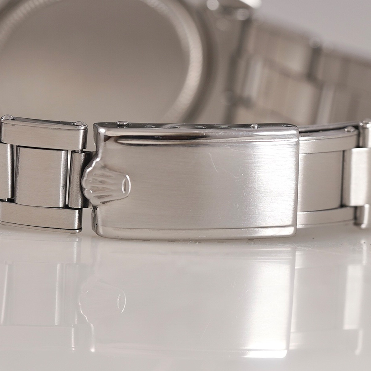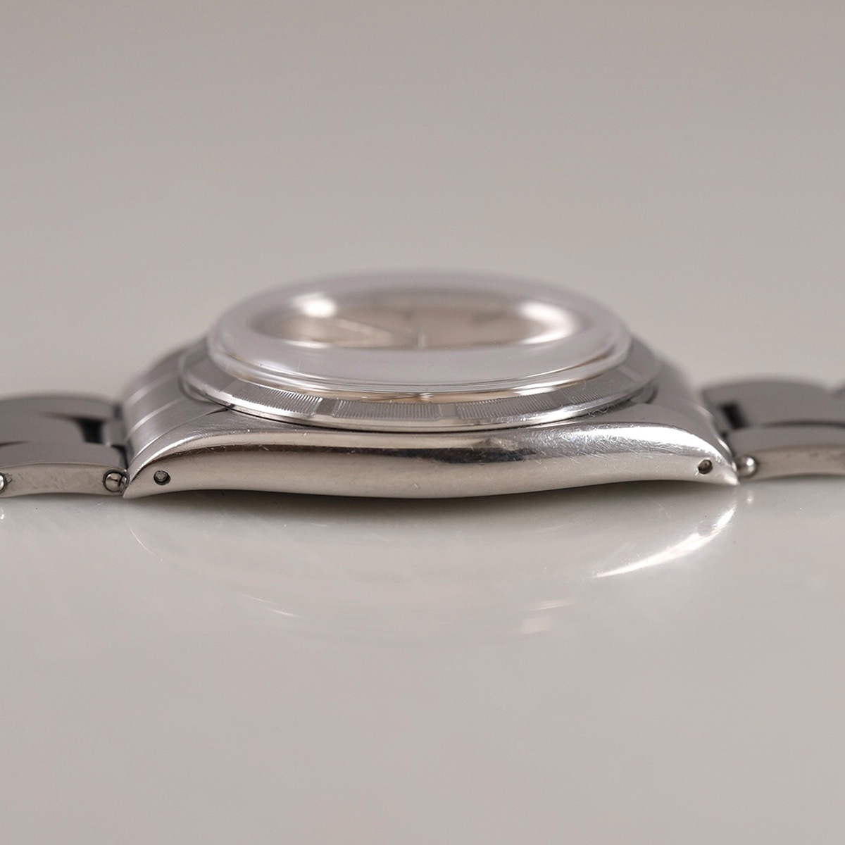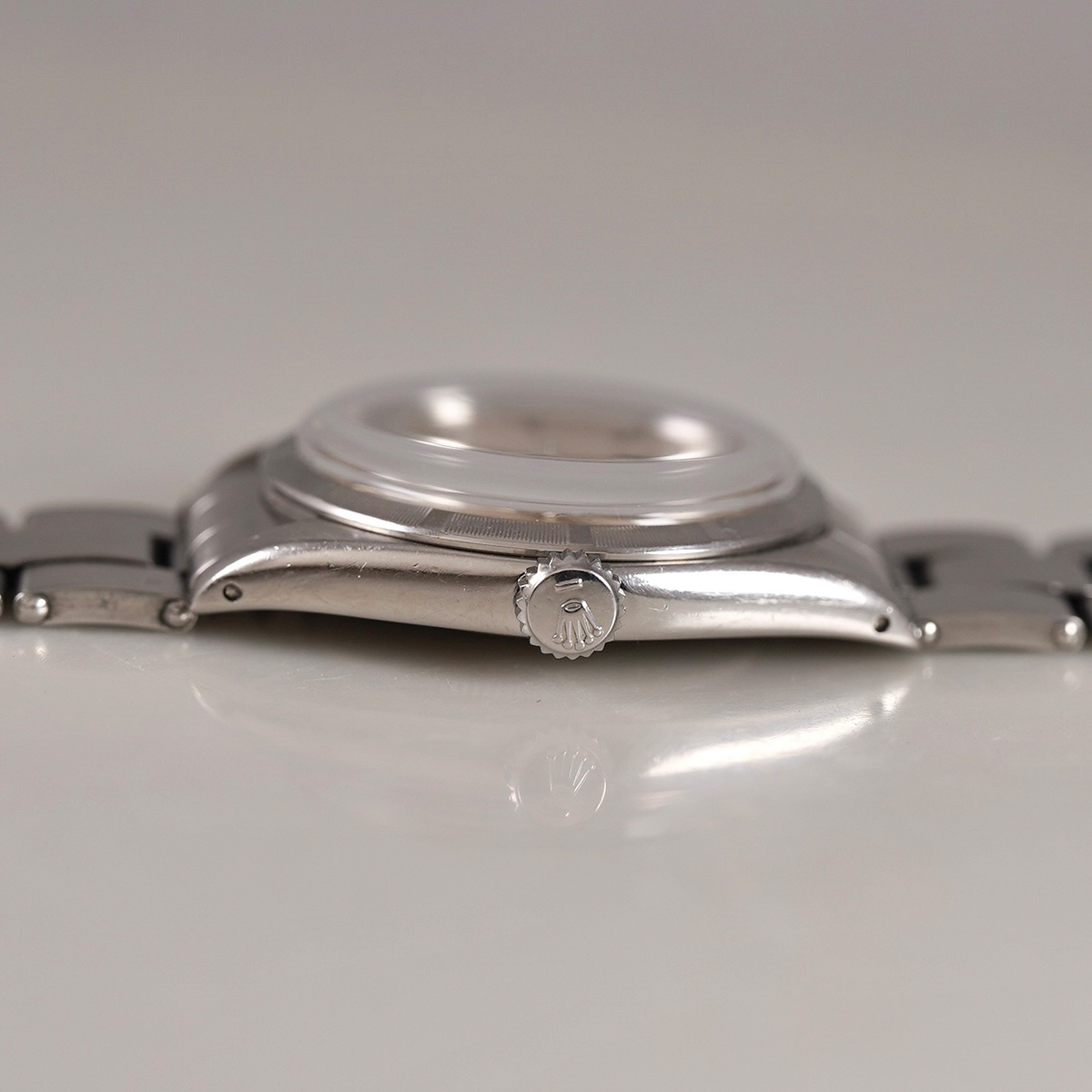 1966年製(裏蓋内:II.66)の手巻きムーブメント搭載、オイスター. Ref.6427(OYSTER)になります。1960年代中頃までにのみ採用された、先の尖ったアルファ針がセットされ、さらにアワーマーカーには楔形のインデックスを配した、この時代ならではの一本です! ほんのり色付いたエイジングダイヤルとのバランスが、とても良く、雰囲気ある個体。 手巻きモデルは自動巻に比べて、ケースが薄く、腕に乗せた時の装着感は、邪魔にならない腕馴染みが良く、男女問わず愛用出来得る優れ物だと思いますので、トータルバランス含め、個人的にとてもおすすめです。ケースやブレスに小傷はありますが、致命的な箇所は無いかと思います。装着されたブレスは、本体と整合性のとれた、FF57-7205 ロレックス純正.リベットブレス(66年4期製)の3連ブレスを装着(11コマ:腕周り〜18.5cm程まで装着可能)。分解掃除を済ませ日差15秒程で稼働しております。 | |